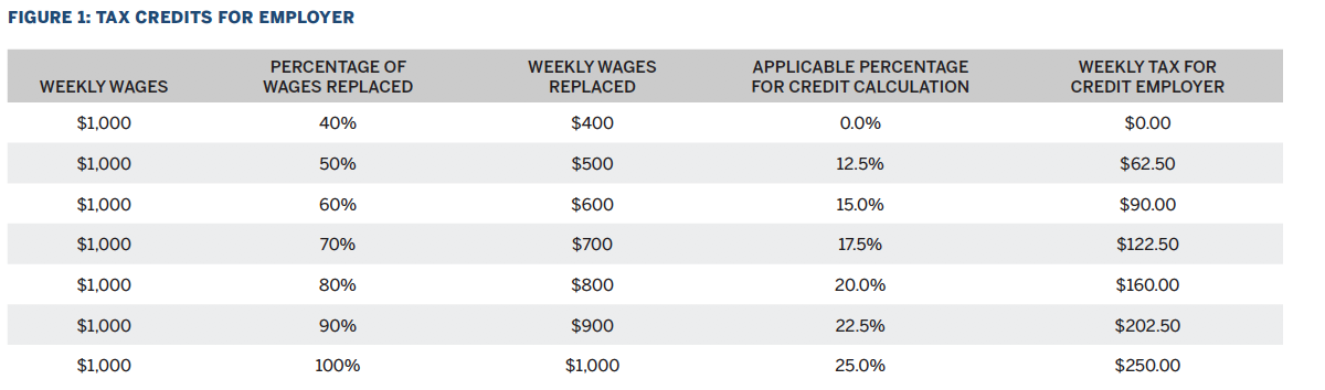 The amount of the paid family and medical leave tax credit is a sliding scale that increases from 12.5% to 25% of the amount of benefits paid to qualifying employees. The amount varies based on the percentage of the wages that are being replaced. The applicable percentage used to determine the tax credit is 12.5% increased by 0.25% for each percentage point that the rate of payment exceeds 50%. The table in Figure 1 is an example of how the tax credit works for an employee earning $1,000 per week and various options for the percentage of wages being replaced while on leave.